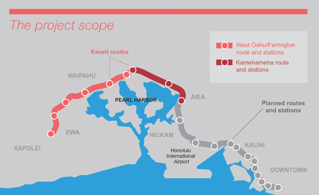 Kiewit is responsible for utility relocations, roadway restoration and all structural work and track installation for the elevated rail system. The team used a variety of unique construction methods to build the guideway through the highly congested areas of Farrington and Kamehameha Highways.