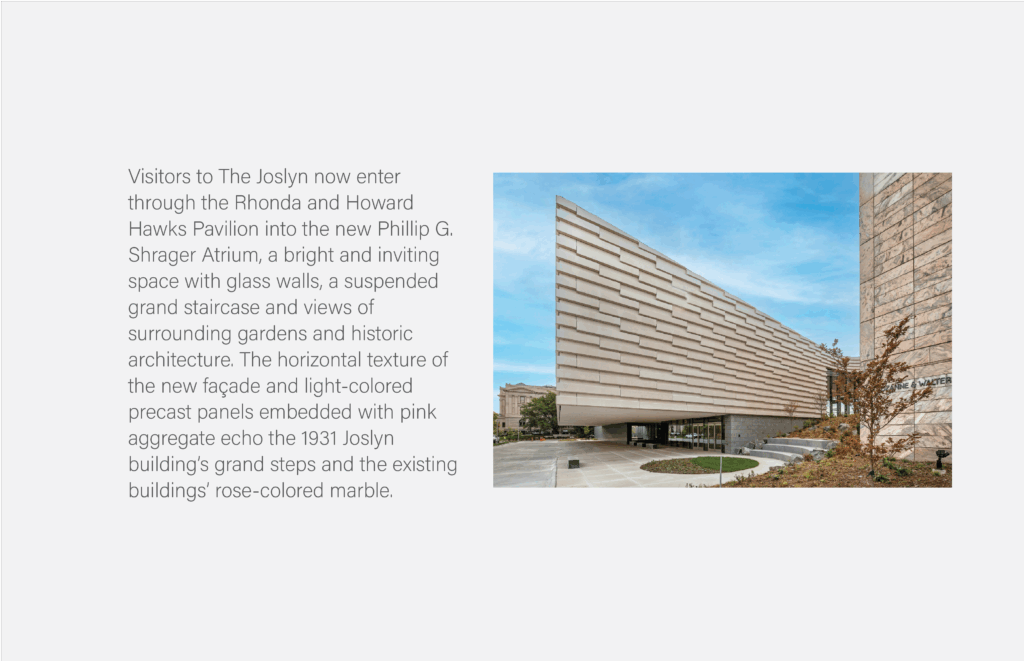 The Joslyn wanted its new building, the Rhonda and Howard Hawks Pavilion, to stand out yet complement the original buildings. The museum hired Norwegian and American architectural firm Snøhetta to design the building. Snøhetta, with help from Alley Poyner Macchietto Architecture, came up with a design concept to mimic “clouds floating over a prairie.”