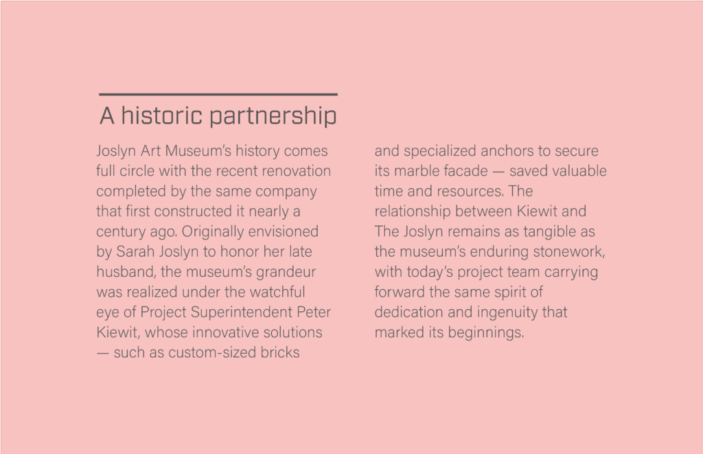 Kiewit is no stranger to The Joslyn in Omaha, Nebraska. Originally built in 1931 by a Kiewit team that included Peter Kiewit himself, the Art Deco museum was expanded in 1994 with the addition of the Suzanne and Walter Scott Pavilion, also built by Kiewit.
