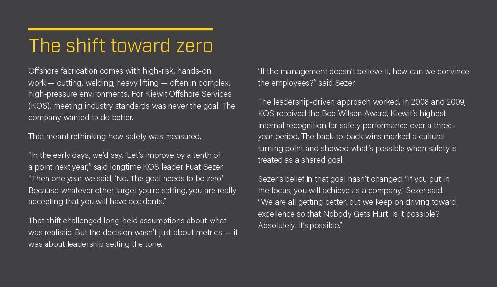 Over the next 40 years, Sezer’s career would rise alongside Kiewit’s growing offshore business. Today, Kiewit Offshore Services, Ltd., (KOS) a subsidiary of Kiewit Corporation, is a leading fabricator for the oil and gas industry — a success story rooted in resilience, innovation and people like Sezer.