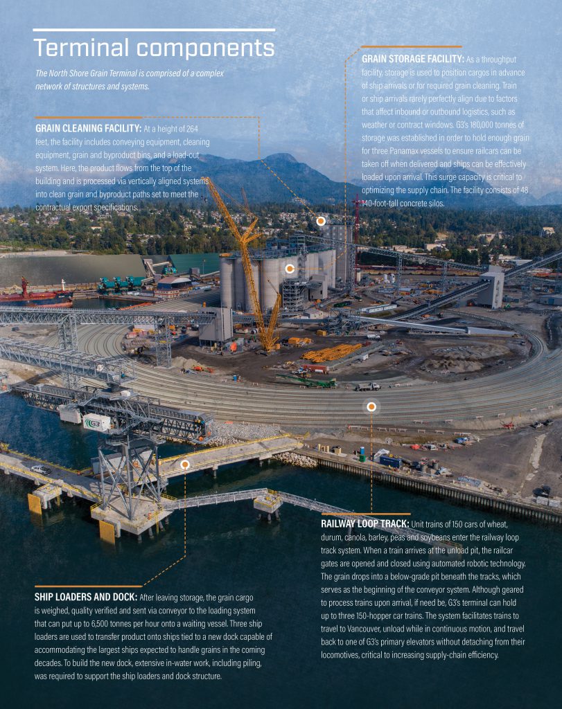 G3 is an integral player in the agricultural export market, with an impressive grain handling network that spans Canada coast-to-coast. The most recent addition, G3 Terminal Vancouver (G3TV), is strategically located on the north shore of Vancouver’s Burrard Inlet. It is the final component of G3’s supply-chain efficiency strategy, effectively bringing farmers’ grain and oilseeds to market. It’s also the first new grain terminal constructed at the Port of Vancouver since the 1970s — and proudly built by Kiewit.