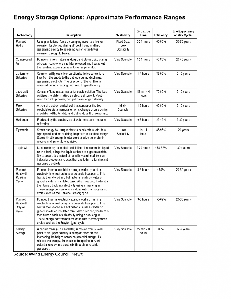 As the power grid continues to face challenges — from aging infrastructure to the increased demand for electricity — utilities will need to continue to explore clean energy sources and adopt new technologies. While energy storage solutions will not solve all these issues, they can offer substantial benefits to utilities now and in the years to come. The following table summarizes energy storage technology options and their key performance metrics.