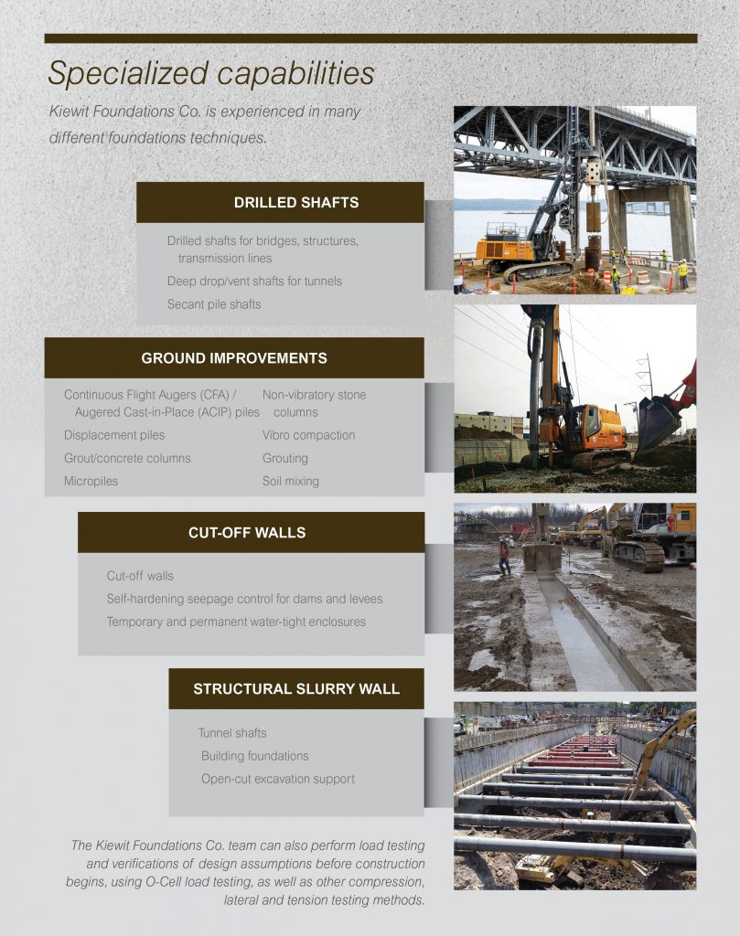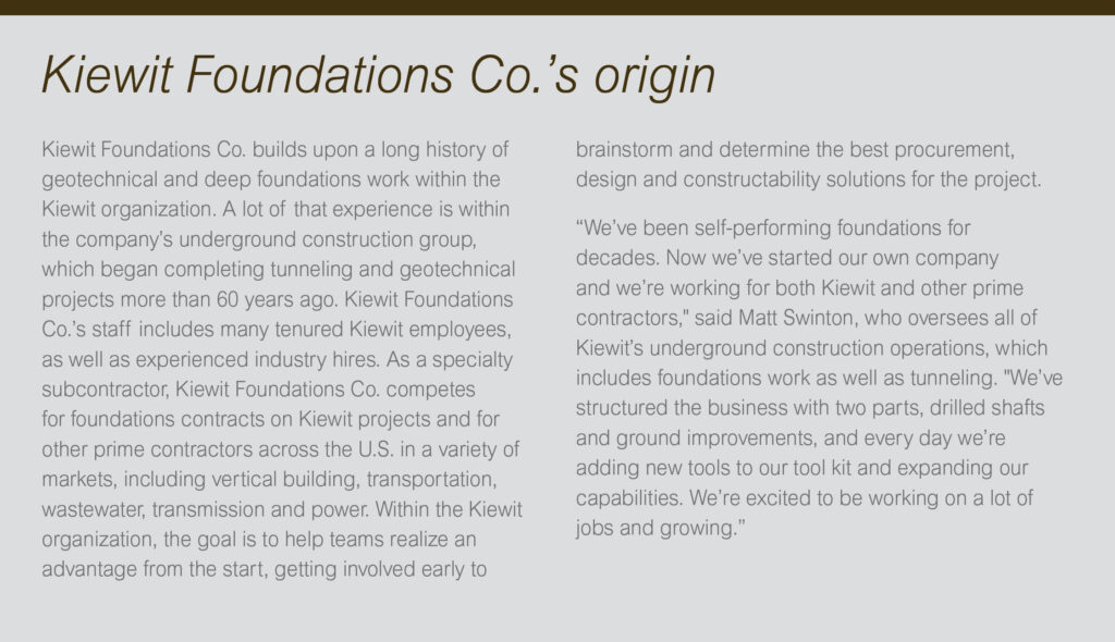 “You need a detailed understanding of the geology,” said Kiewit Foundations Co. manager Scott Wimmer. “Rock characteristics, soil types, groundwater tables and other geotechnical data help us determine the best solutions and proper equipment and tooling selection.”
