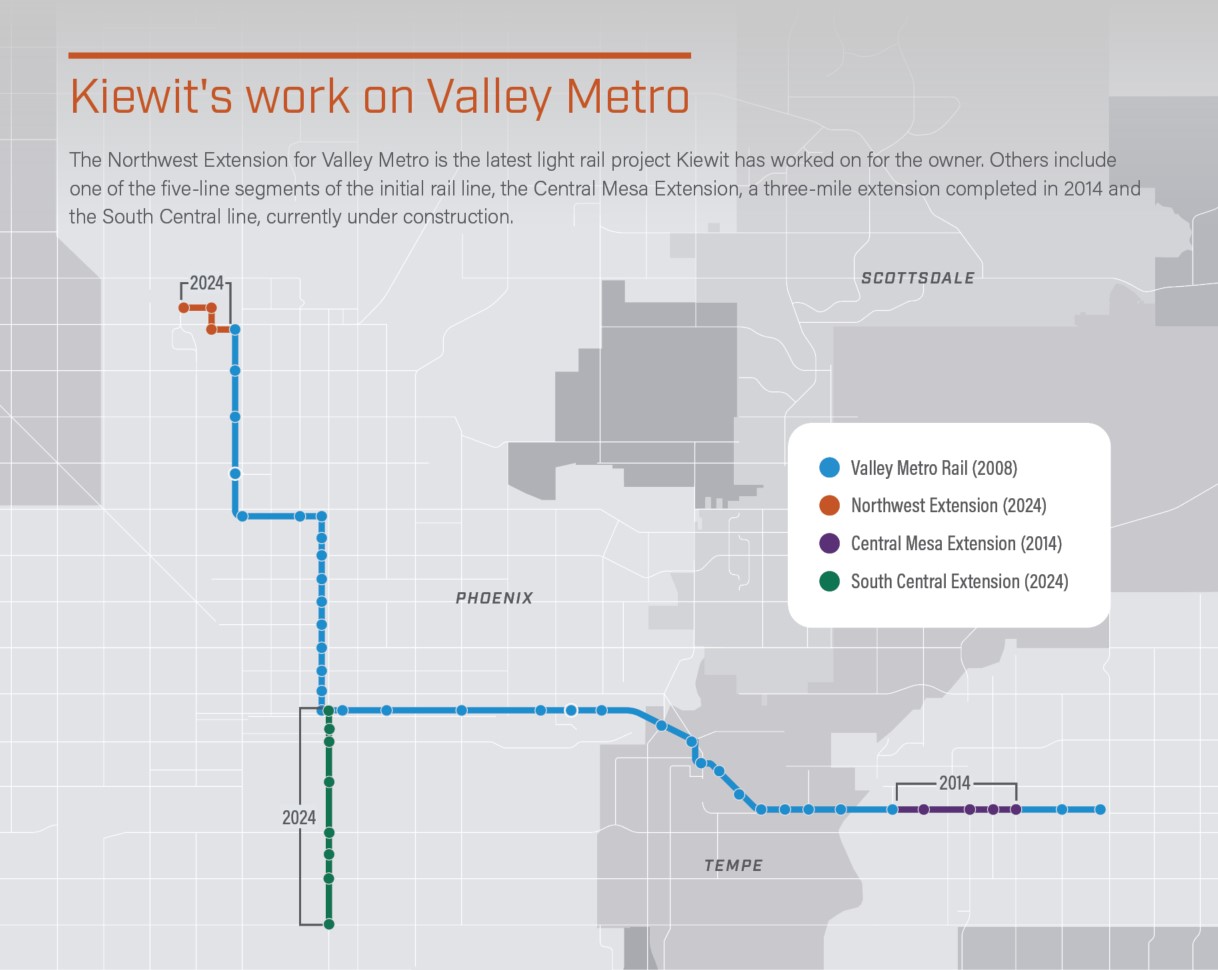 Serving Northwest Phoenix, this extension is the latest Valley Metro light rail project for Kiewit. The project was made possible by a Kiewit-McCarthy joint venture (KMJV), with support from Kiewit subsidiary Mass. Electric Construction Co.