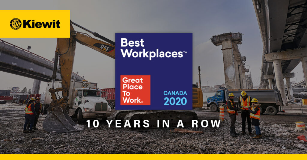 Today, Kiewit was named to the Best Workplaces in Canada list for the tenth year in a row. Kiewit ranked #13 on the list of companies with 1,000 or more employees.