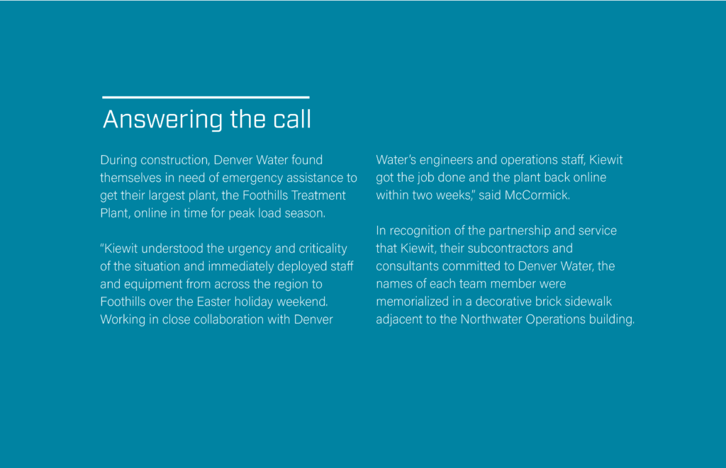 “Anytime we needed support on specialized things like that, the Kiewit team jumped on it in a hurry,” Dunham said. McCormick emphasized Denver Water’s appreciation of the wide-reaching expertise, tools and resources that Kiewit brought to the project. “At the end of the day, it’s all about people, and we’re fortunate that we have had such great people from Kiewit on this assignment for the entire project.”