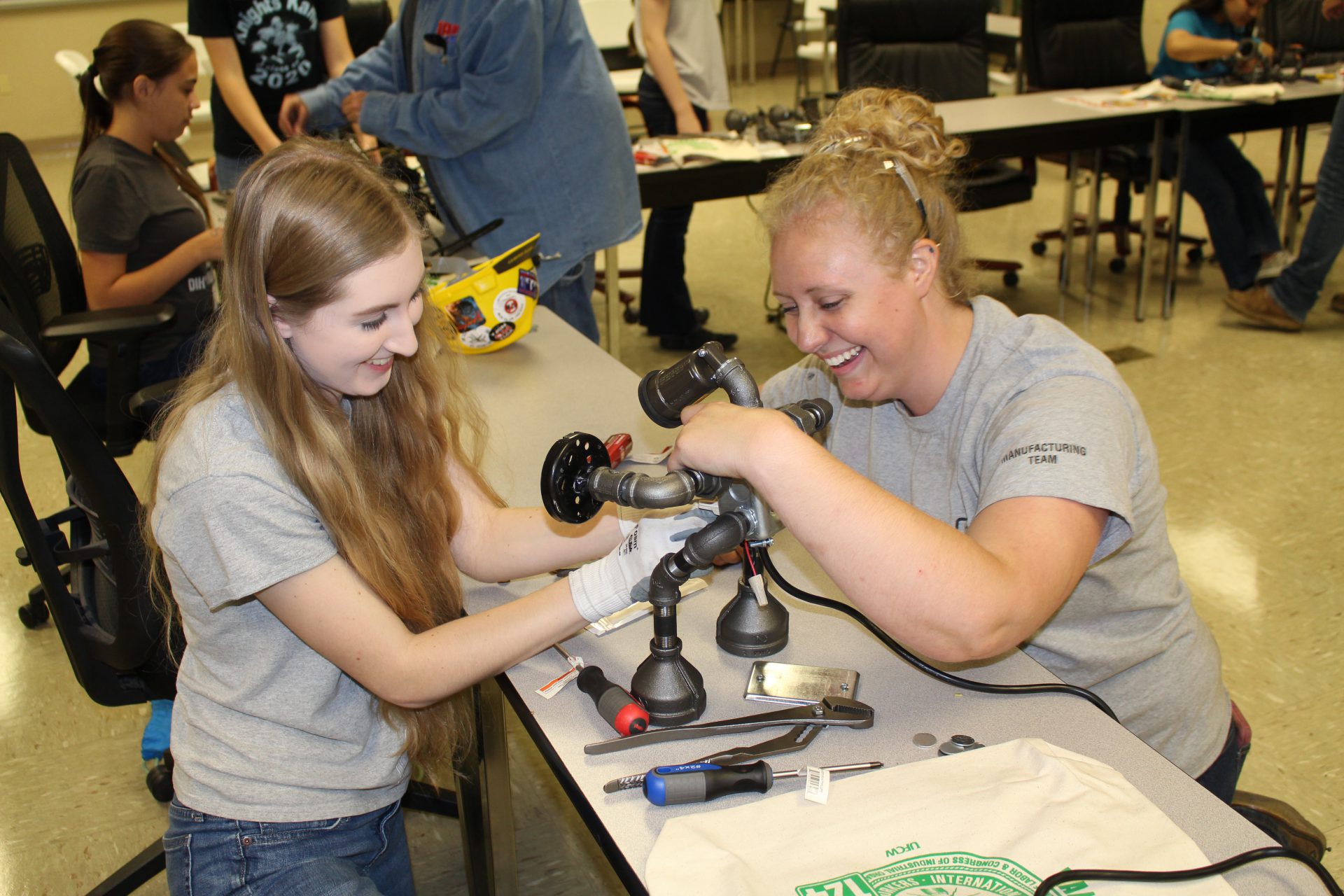Camp NAWIC teaches girls basic carpentry, electrical and welding skills through a series of hands-on activities. This year’s projects included tack welding signs made of copper pipe, wiring lamps, and operating a 90-pound jackhammer and a mini-excavator.
