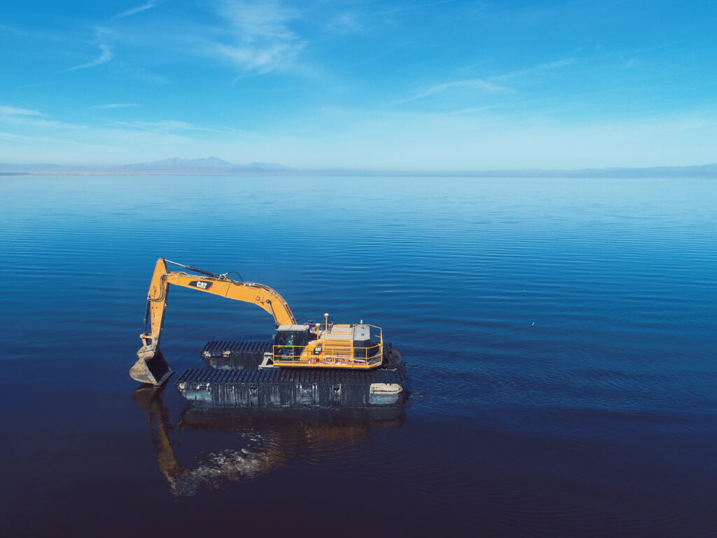 For Salton Sea, the right equipment had to be low ground pressure and multiple solutions were needed. Many of the units are almost amphibious in nature. A pontoon excavator and low ground pressure dozers and scrapers were among more than 150 pieces of equipment on site.
