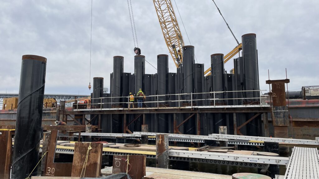 Kiewit self-performed much of the scopes involved in pile driving, wharf compaction and concrete structures. At the central wharf, a dual-probe vibrocompaction method was employed to place and compact 400,000 cubic yards of material through 40 feet of water to connect the two finger piers — the first time this technique was used in the United States. What sets this method apart is its use of two vibratory probes instead of one, allowing for the compaction of larger sections of ground in less time. This process streamlined a critical phase of the project, where the frames were needed to support massive lengths of pile above the water’s surface.