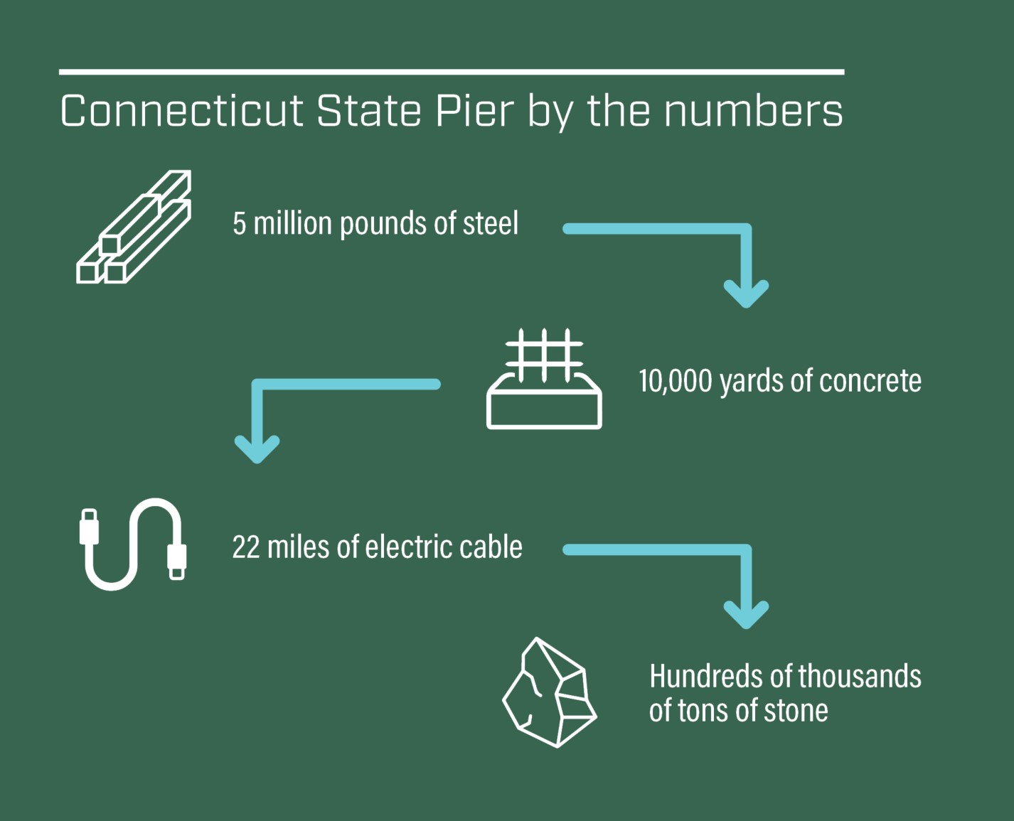 Nearly 5 million pounds of reinforcing steel, 10,000 yards of concrete, 22 miles of electric cable and hundreds of thousands of tons of stone fill went into upgrading the New London pier. Now, the site stands ready to support offshore wind projects commissioned by Connecticut, New York and Rhode Island. A total of approximately 160 turbines, with an output of 1,760 megawatts (enough to power over 1 million homes) are scheduled for assembly and delivery from New London.