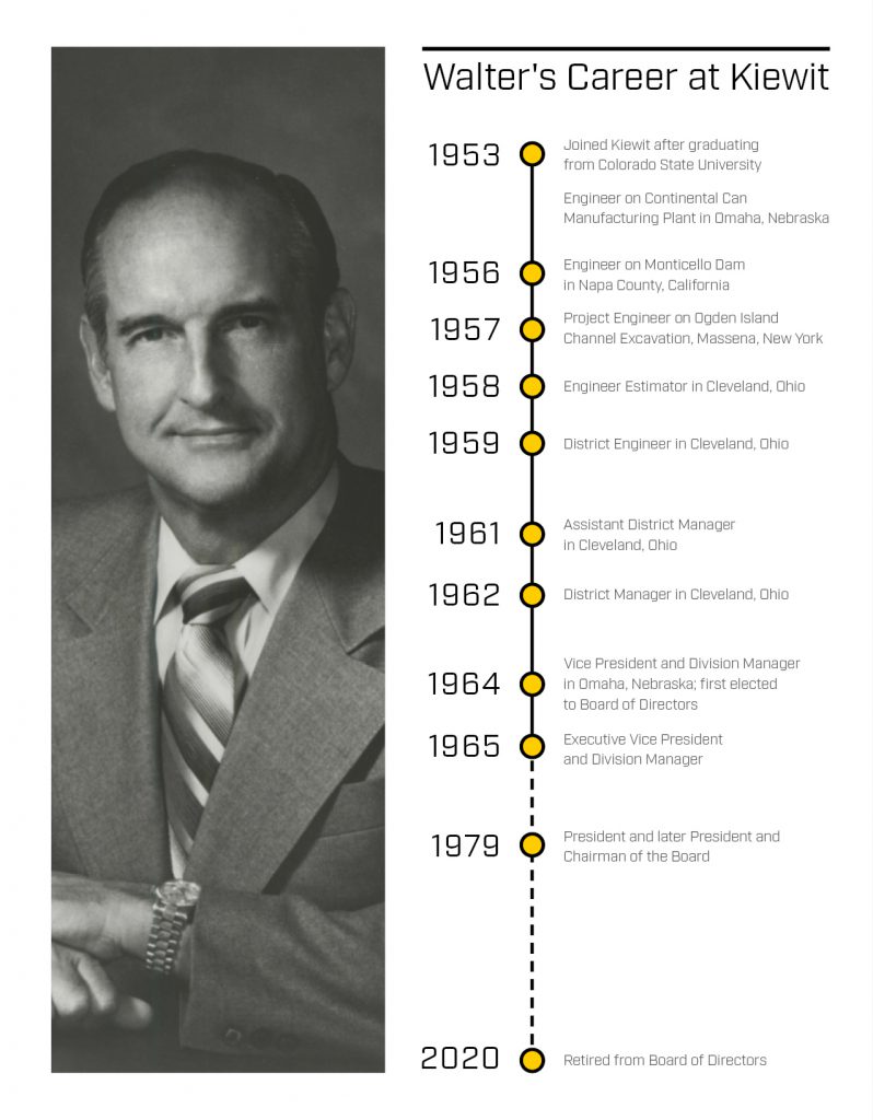In November 1979, Peter Kiewit called from his room at Clarkson Hospital. He said he felt his time was short and wished Walter the best of luck. He never made it out of the ICU following surgery and Walter would lead the company with distinction for the next 19 years.