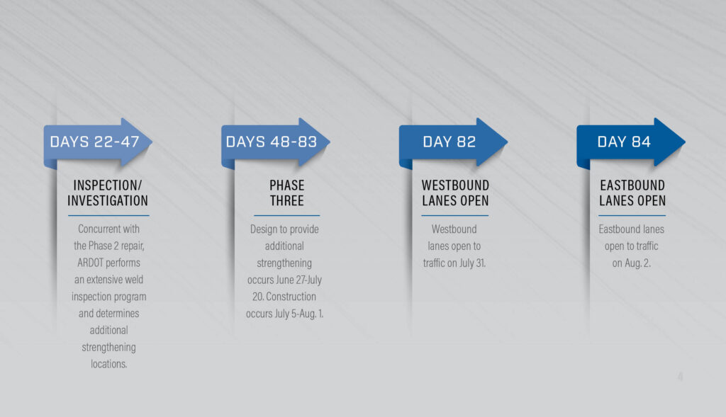 Ultimately the project required three phases of construction to stabilize the bridge, repair the fracture and strengthen additional locations.