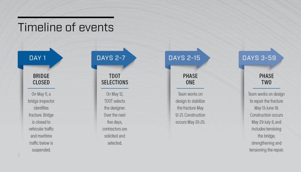 By May 14, the Tennessee Department of Transportation (TDOT) released a request for proposals (RFP) for repairs to the bridge. On May 17, TDOT informed Kiewit Infrastructure South Co. it had won the job.