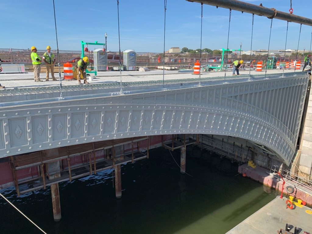 For the bascule span, Kiewit installed a “jackup barge” to support the bridge during phased removal while still maintaining traffic. The existing bascule bridge was replaced with a new fixed span bridge while preserving major historical elements of this structure. An extensive marine fleet was mobilized to site to construct many elements of the bridge. Several of the barges supported cranes, excavators and other construction equipment to remove portions of the bridge, install new steel and concrete, clean the granite, and perform bridge repairs.