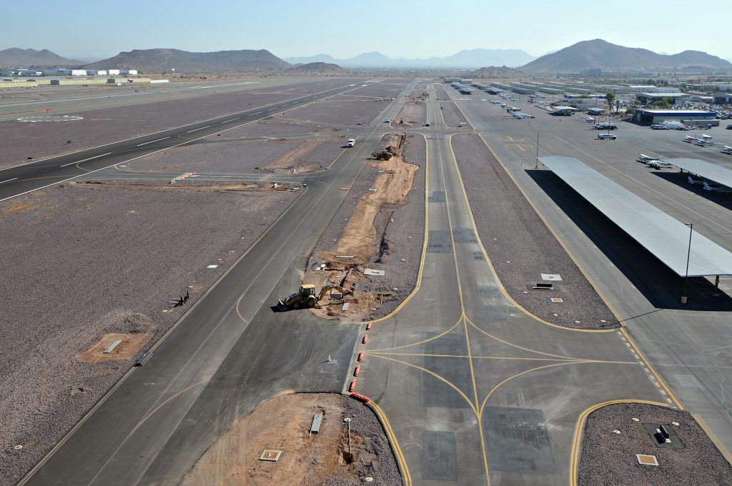 The Deer Valley Airport Taxiway project consisted of the design and construction of a new Taxiway D (TWY D) located south of Taxiway C (TWY C) at the Phoenix Deer Valley Airport. The hold bars south of RWY 7R/25 were located 150ft south of the runway centerline. The design standard is 250ft, meaning the standard could not be met with the taxiway configuration without blocking traffic on TWY C. The addition of TWY D as recommended in the DVT Master Plan Update solved this problem. The project was constructed in phases consistent with FAA grant funding availability. The scope of this project included: relocation of the main electrical vault, expansion of the existing vault room and an additional regulator, new signage and LED lighting for new Taxiway D, the construction of connectors and shoulders, relocating Taxiway C hold bars, and existing helicopter landing pads, and improvements to existing drainage. The Project was delivered on time and under budget.