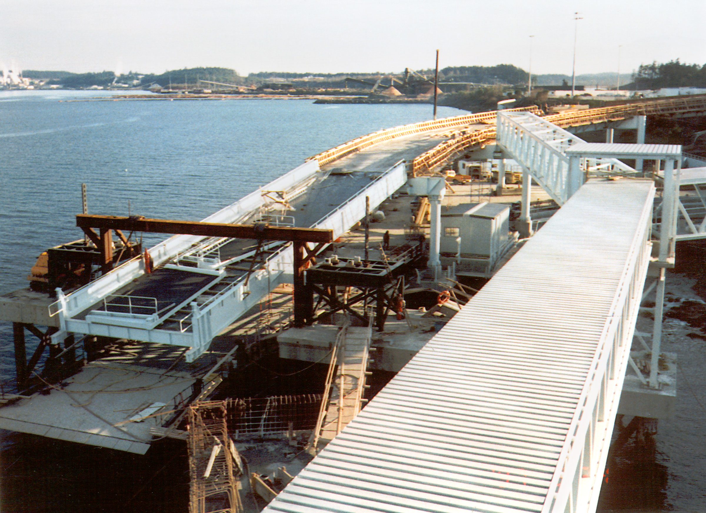 The upper and lower loading ramps weighed 91 and 154 tonnes, respectively, and were floated into position during high tide and lowered into place by a crane during a six-hour low-tide window. The berth required construction of over 726 tonnes of structural steel, more than 3,000 cubic metres of concrete and in excess of 4,600 square metres of formwork. Additional quantities included placing more than 1,100 cubic metres of land concrete and 2,000 cubic metres of marine concrete.