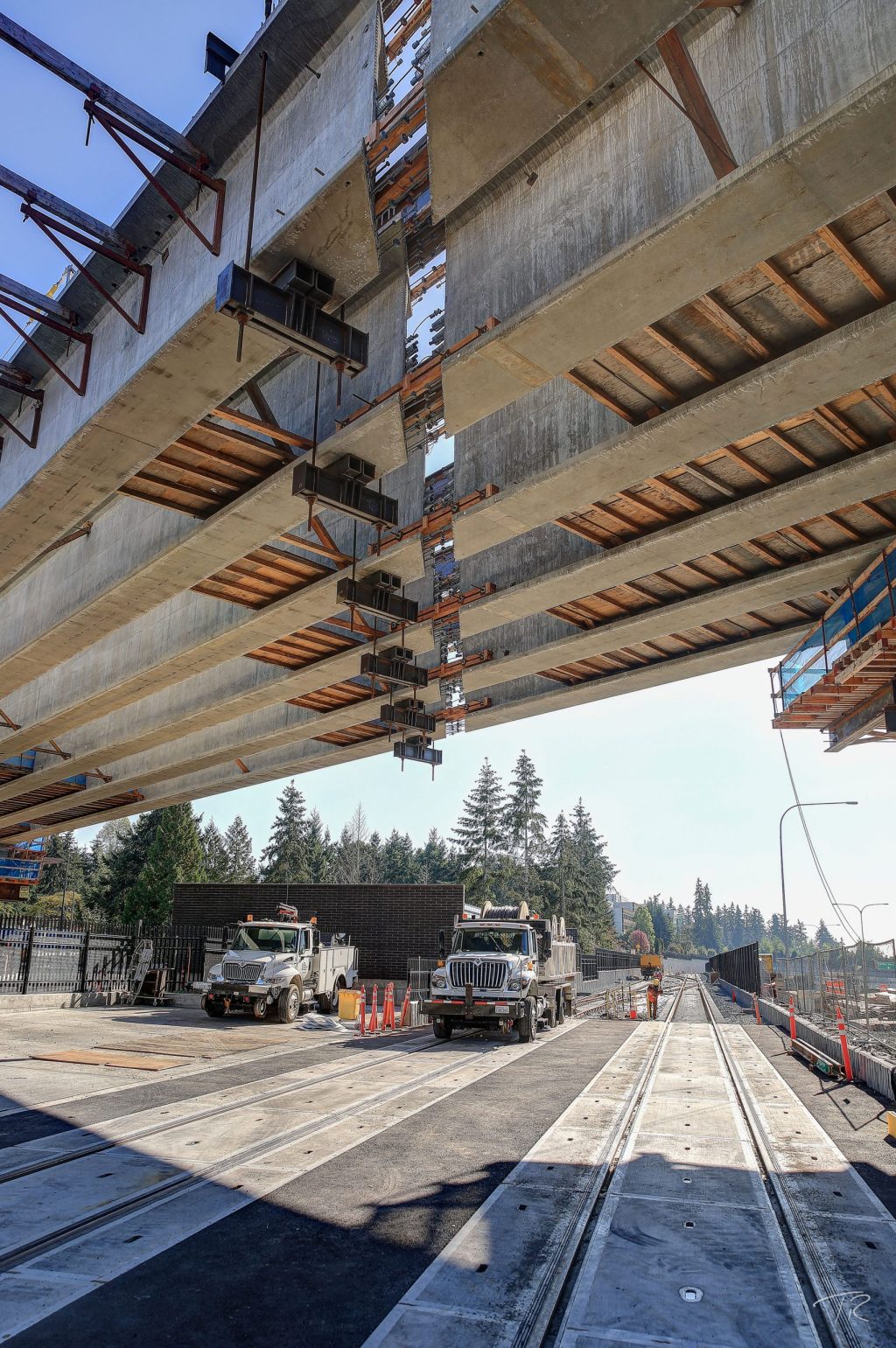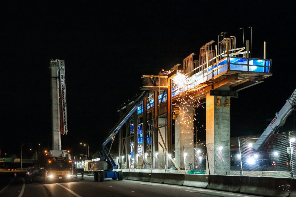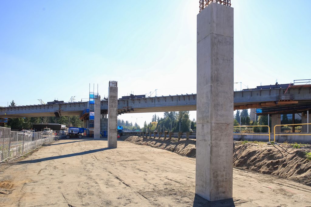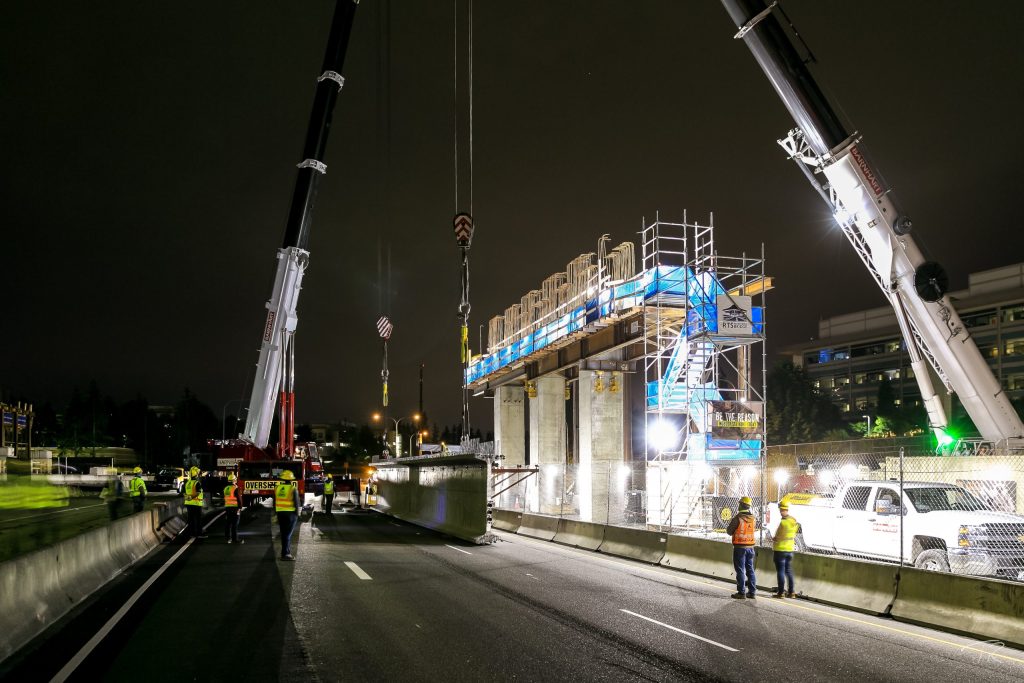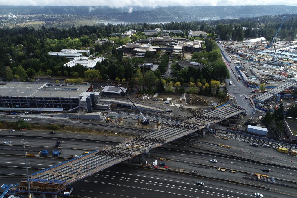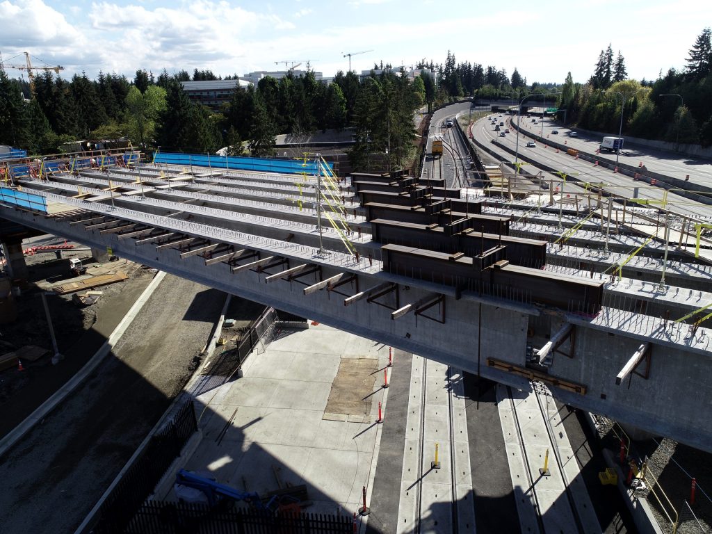 The joint venture project was the final segment in the East Link Extension that will take light rail from downtown Seattle to Redmond. The alignment included 1.8 miles of double-track light rail transit infrastructure on elevated and at-grade guideway through retained cuts and fills. The work also included two at-grade stations – Overlake Village near 152nd Avenue NE, and Overlake Transit Center (terminus station) with a pedestrian bridge over SR 520 to residential areas. Station work included an integrated three-story, 320-stall parking garage and bus transit center, passenger drop off areas, and ancillary office space. The client ultimately extended the scope to include a pedestrian bridge at Microsoft (RTS Pedestrian Bridge). The Kiewit-Hoffman team was selected in part because of its proposed innovation to integrate the bus transit center into the bottom floor of the parking garage, which left a significant parcel of developable land for the client.