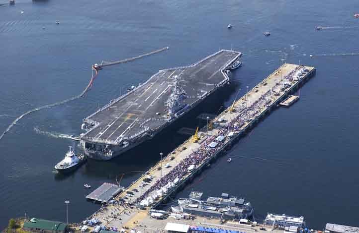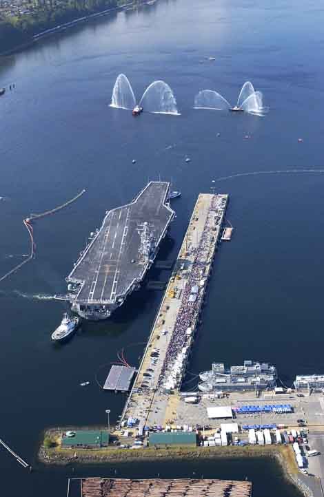 Kiewit completed the $56 million Puget Sound Carrier Support Complex in February 1992 for the Department of the Navy. The pier provides mooring facilities for the aircraft carrier base. The contract included construction of a 1,680-foot-long by 126-foot-wide carrier pier and a 470-foot-long by 144-foot-wide marginal wharf for escort vessels. The carrier pier is supported on 1,162 24-inch-wide octagonal hollow prestressed concrete piles, which are 116 feet to 190 feet tall. The wharf is founded on 557 20-inch-wide octagonal solid prestressed concrete piles.