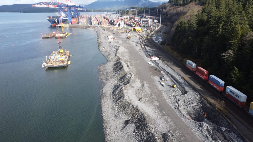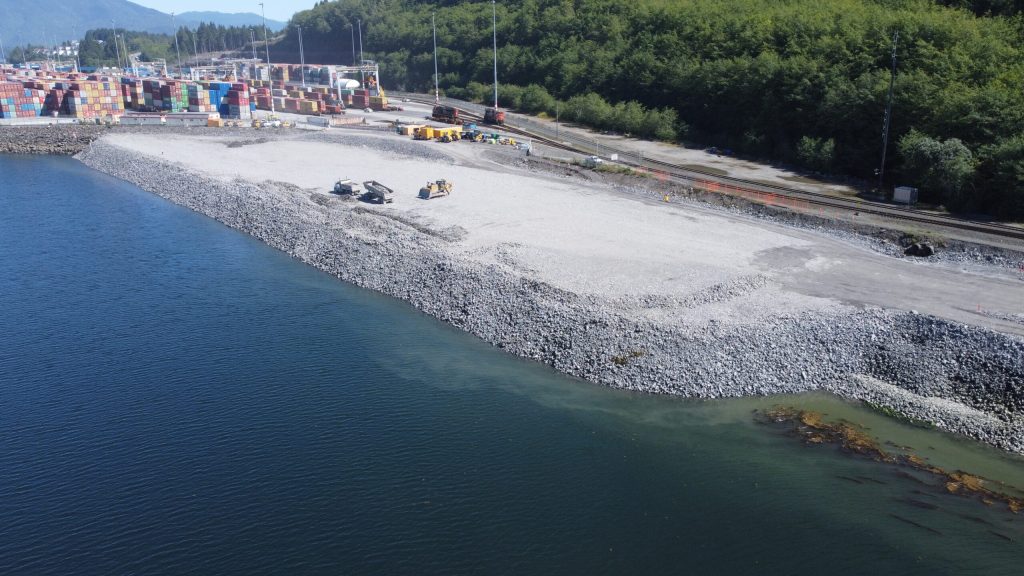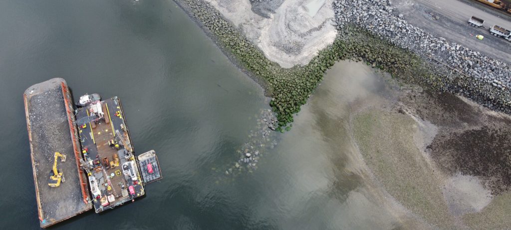 Kiewit utilized its extensive fleet of floating equipment, including marine derrick barges, tugs and workboats, to complete most of the construction. The team removed 82,000 cubic meters of soft compressible material from the reclamation footprint, 65,000 cubic meters were utilized in environmental offsetting and 36,700 cubic meters were disposed upland.
