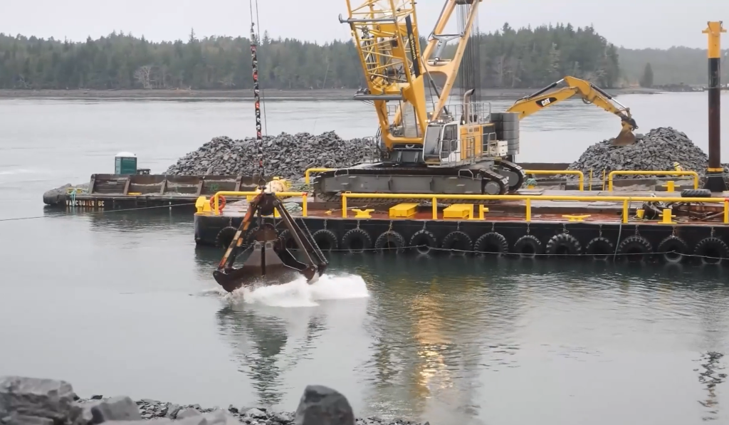 - Using Liebherr, 895 duty cycle cranes on marine spud barges, Kiewit 210 and multiple flat-deck barges to transport 400,000 cubic meters of rock and riprap.