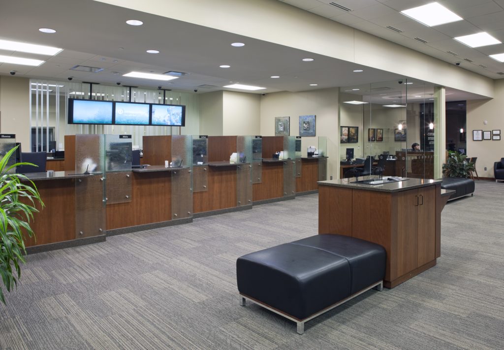 The Ames branch office of First National Bank is a 4,800 SF building, containing offices, a conference room, reception area, teller stalls, and a vault. Kiewit installed state-of-the-art mechanical and security systems, and constructed the building with a structural wood framing and a masonry exterior closure. Aesthetic enhancements made to the building include teller stations with art glass and solid surface countertops.
