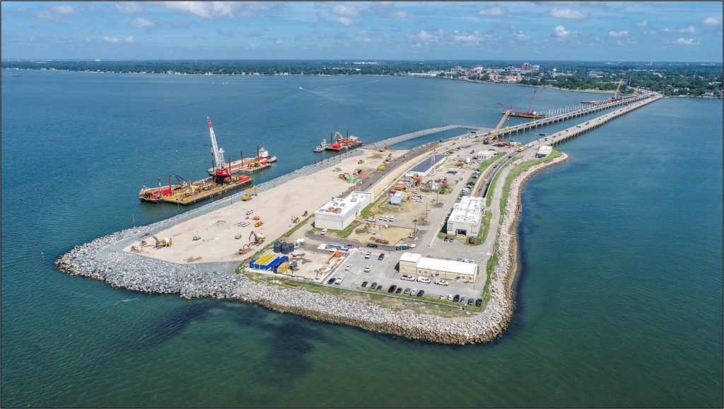 Kiewit subsidiary Weeks Marine expanded the four-lane bridge-tunnel along 3.5 miles of I-64 in Norfolk and Hampton, Virginia, with two new twin tunnels across Norfolk Harbor. This addressed congestion and increased transit capacity. Weeks was subcontracted to extend the island at the north end of the tunnel. It used its specialized marine fleet, which included large gantry cranes and excavators with GPS systems, to place rocks across 350-foot areas without moving the barge, contributing to a timely completion.