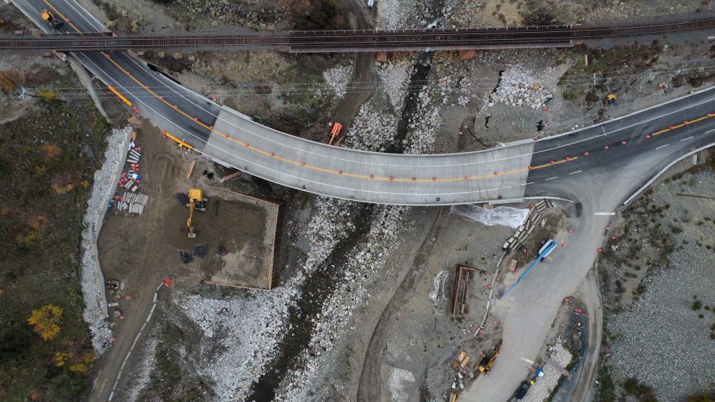 The new 69-metre, two-lane curved steel plate girder bridge was designed for seismic resilience, durability and climate readiness. Construction involved complex girder erection on steep grades and innovative sequencing that allowed traffic to keep moving through a single-lane alternating detour. A prefabricated detour bridge was later removed in a tandem crane lift and transported on self-propelled modular transporters during a single overnight closure, reducing delays and accelerating critical path work.