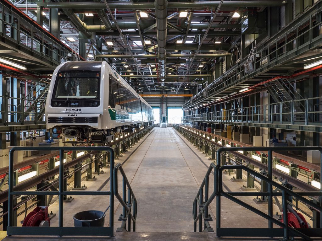 The first building is a 144,000 SF operations and servicing building divided into two primary areas. The first primary area is for warehousing and offices, including the operations control center, from which the whole system is managed and is supported by closed-circuit security cameras and attendants on each train and at each station. The second primary area of the building houses the main maintenance facility for the system. It has four train tracks running through it.