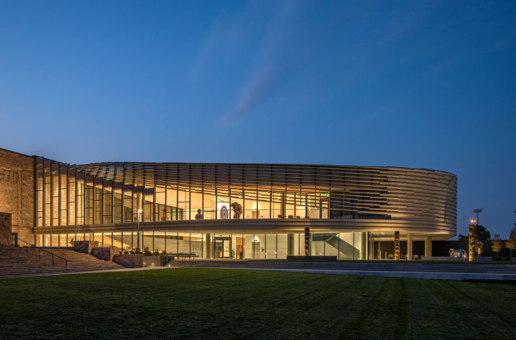 Designed by Snøhetta in collaboration with Alley Poyner Macchietto Architecture, the concept for the Rhonda & Howard Hawks Pavilion was intended to mimic “clouds floating over a prairie.” The two-story, 42,000‑SF structure features only two traditional 90° corners. The remaining facades flow in concave and convex curves that merge with a gently sloping roof and historic buildings.