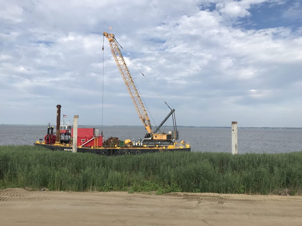 The team used the Weeks 551 clamshell dredge and the Weeks 320 unloader to pump the material from the scows to the upland disposal area.