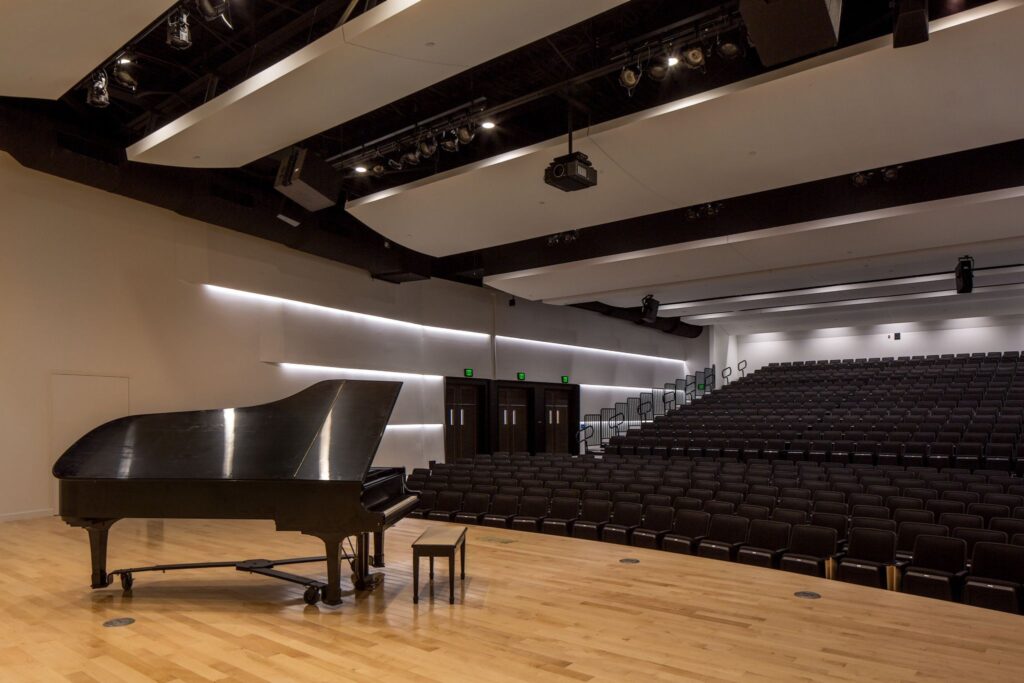 Over the course of 12 months, the Temple’s classrooms were transformed into teaching studios; administrative offices were re-worked into group classrooms; and the former conference center became a café and lounge. The sanctuary and social hall were re-configured into a signature performance venue with state-of-the-art acoustic elements, fixed seating for 200, and retractable seating to accommodate an additional 300 people.