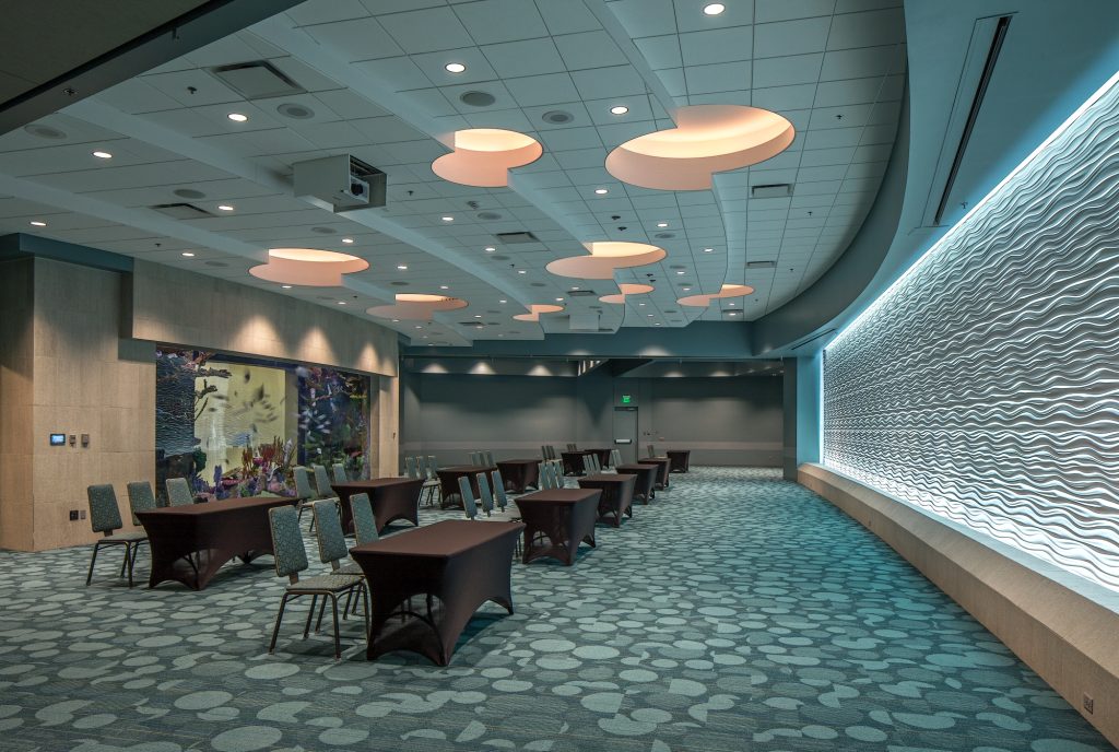 In addition to the upgrades on the front of the building, the Aquarium Conference Center (ACC) also received a significant facelift. The concourse area was expanded and remodeled, the restrooms remodeled, and the 4,000 SF gathering space was given all new finishes, including ceiling, paint, flooring, and lighting, as well as some audio-visual upgrades throughout. In the back of the house, an expansion to the Servery was included to provide additional storage and prep space for the many events that are held in the ACC.