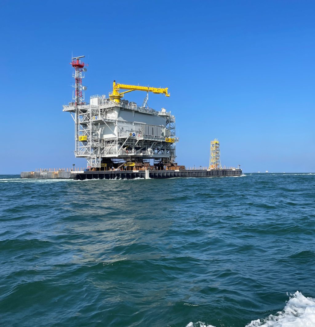 The South Fork Wind Offshore Substation was built at Kiewit’s 555-acre fabrication yard in Ingleside, TX and was then shipped across the Gulf of Mexico, up the east coast to Rhode Island for installation.