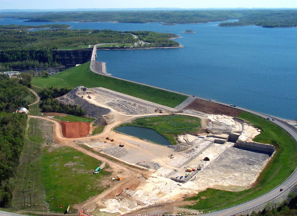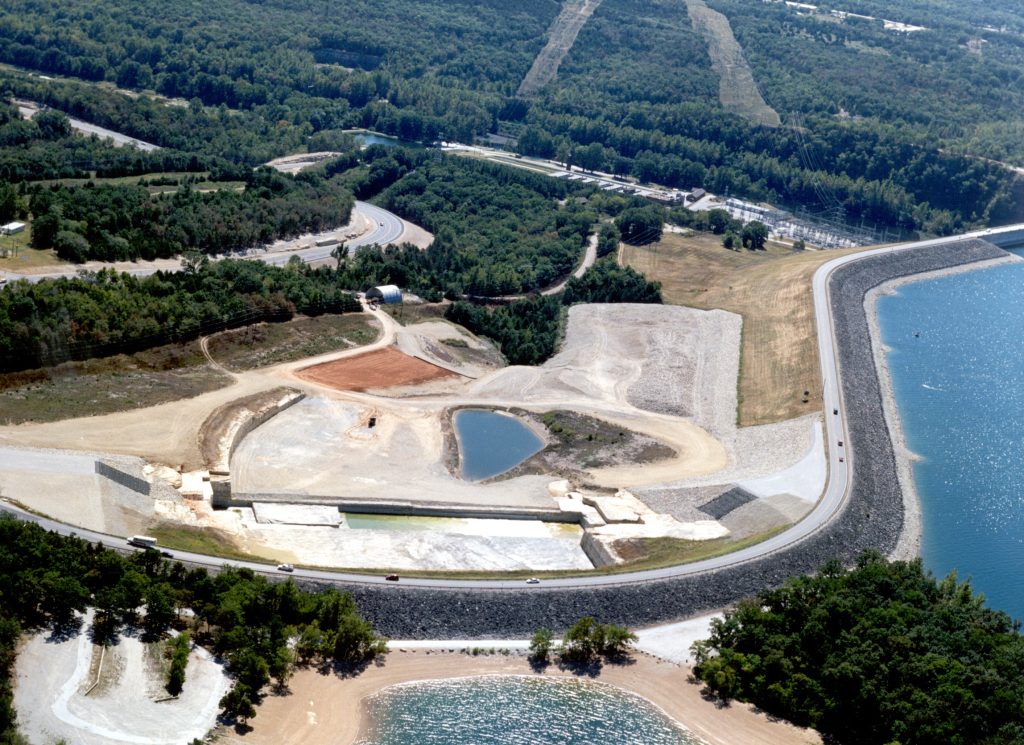 To prevent water from flowing under the base of the dam, crews placed a 1,230-foot-long by 95-foot-tall grout curtain. To construct the curtain, a line of holes was drilled and pressurized grout was forced into the rock seams. Crews completed the project in September 2000, four months ahead of schedule.