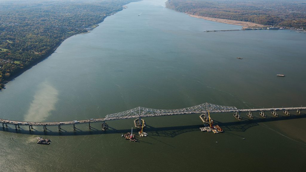 Kiewit subsidiary Weeks Marine, Inc., has worked on the Tappan Zee Bridge since the early 2000s — initially, as part of Grow Tunneling, securing a contract to construct a groundbreaking pier protection system. Designed by URS Greiner, the system featured precast “T-beam” fenders supported by 96 pipe piles, each capable of bearing between 500 and 750 tons. Concurrently, Weeks executed load testing, armoring and dredging to create a construction access channel for the Tappan Zee Bridge Replacement project.