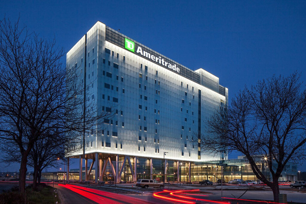 The TD Ameritrade Headquarters project consists of a 535,000 SF office building with a 760-stall, two-story parking garage. The building consists of a 12-story office tower connected to a two-story, 600 SF pavilion with underground parking on the basement level. The project achieved LEED Platinum Certification.