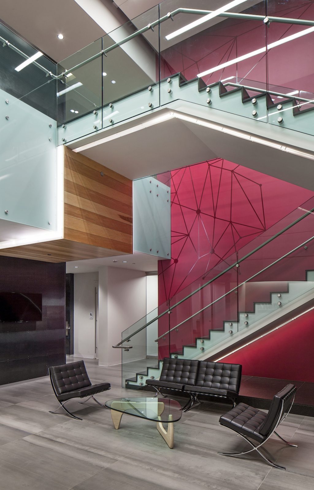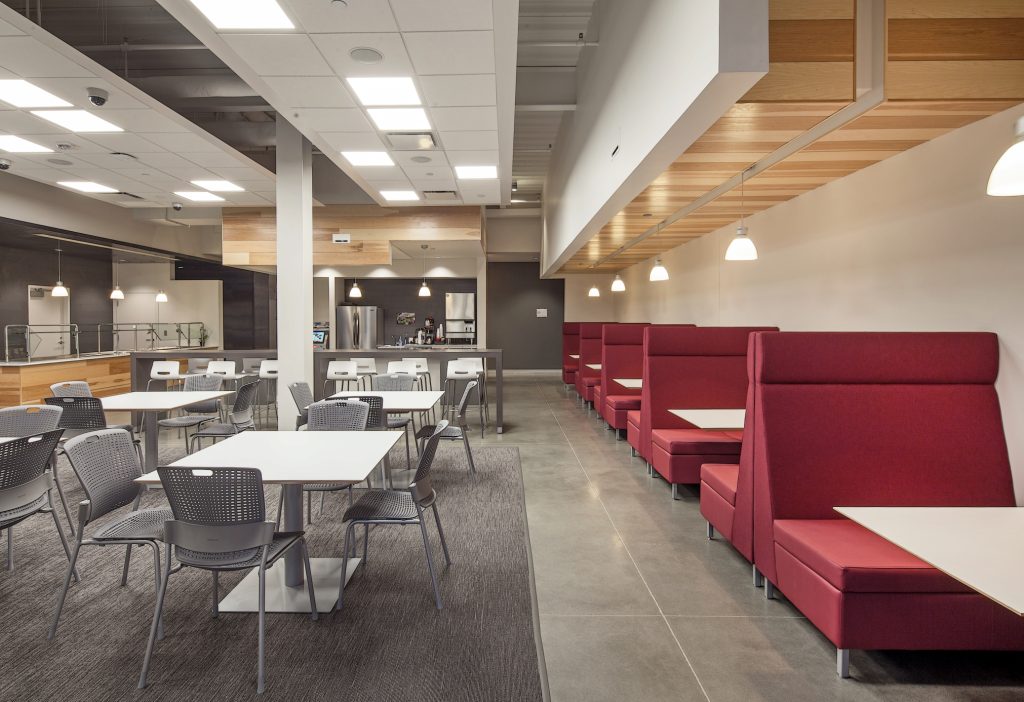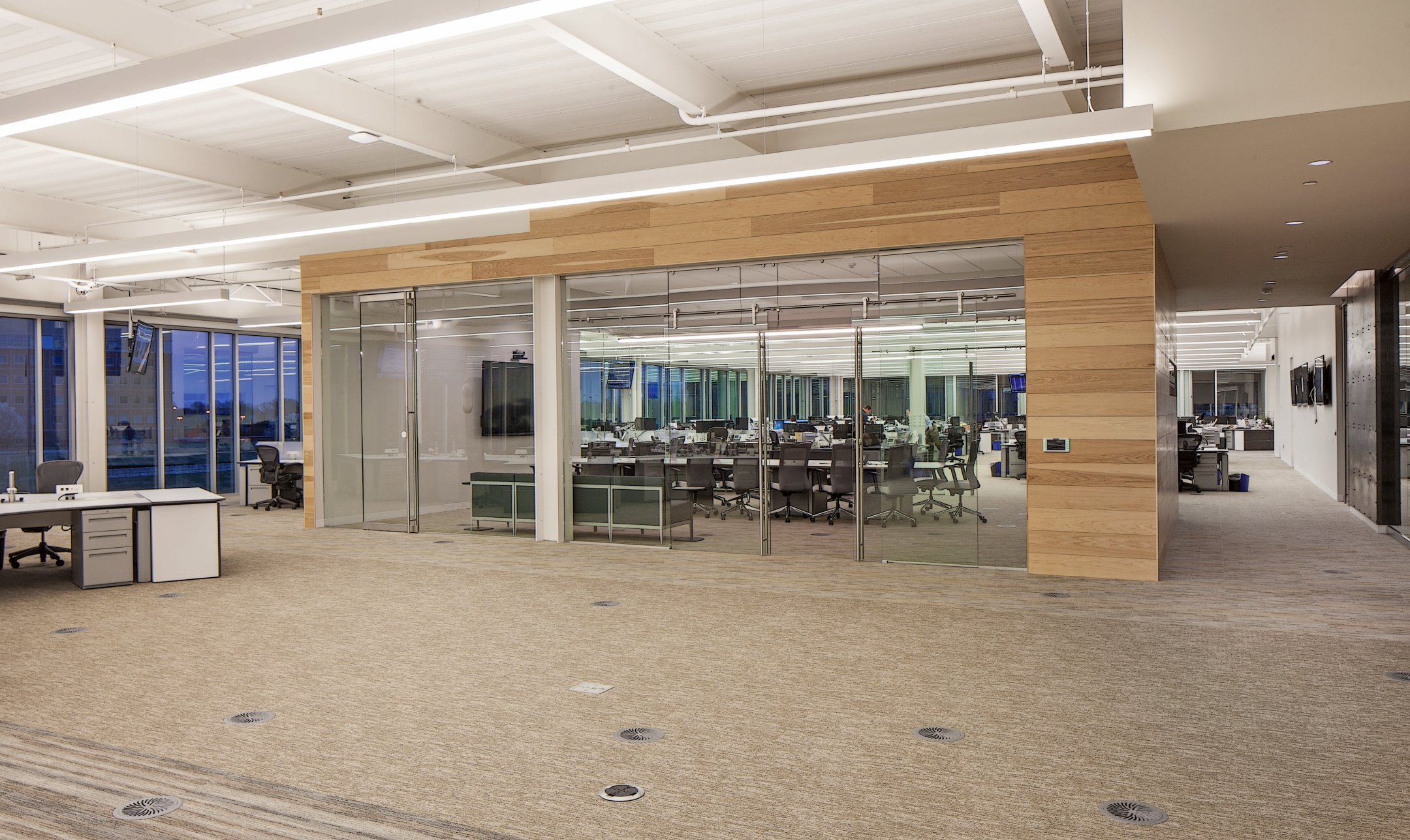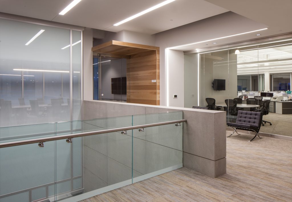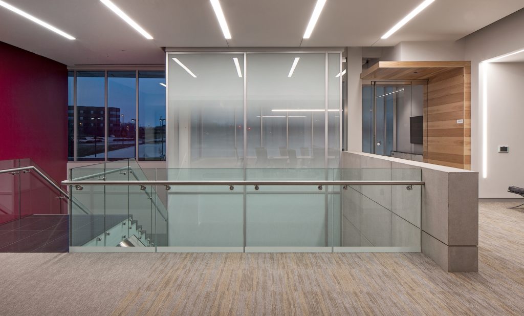 20,000 SF open state-of-the art trading floor, 15-stall parking garage at ground level, five-level MEP Penthouse, electric car charging stalls, 305-stall paved parking lot, and an outdoor patio with access to walking trails and adjacent green space. The four-story office building has an appealing exterior finish of exposed cast-in-place concrete walls, pre-cast panels laid with thin brick, three colors of metal panels, and aluminum storefront systems.