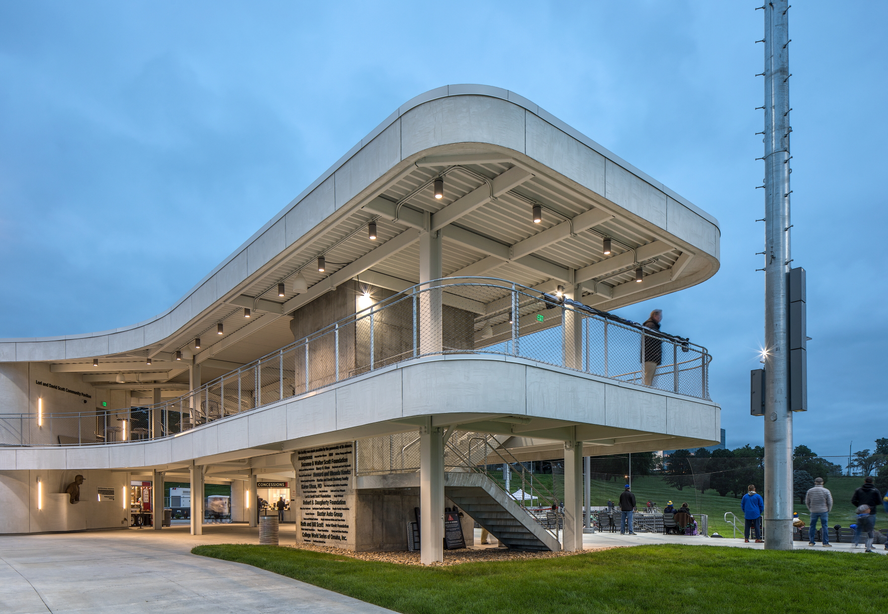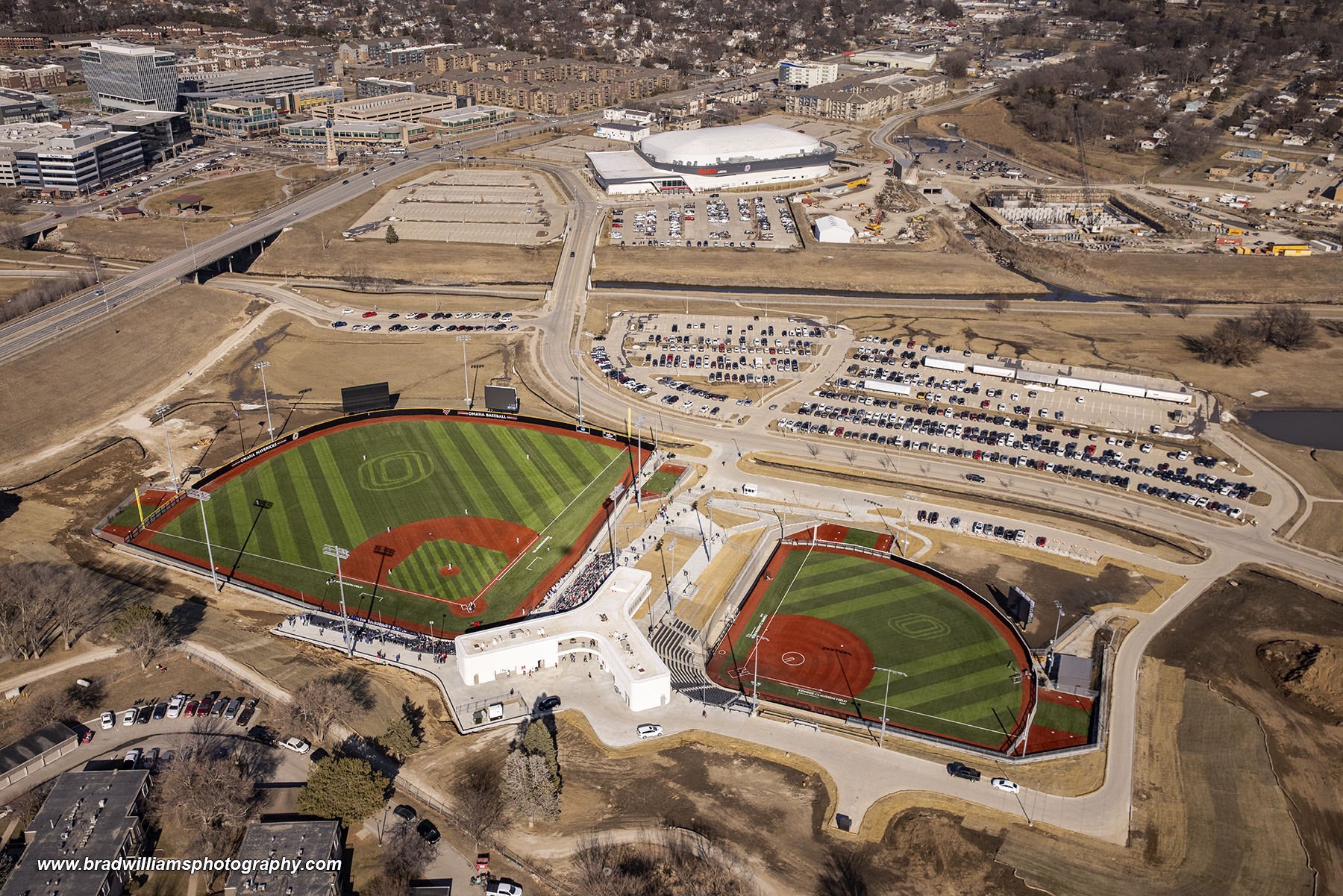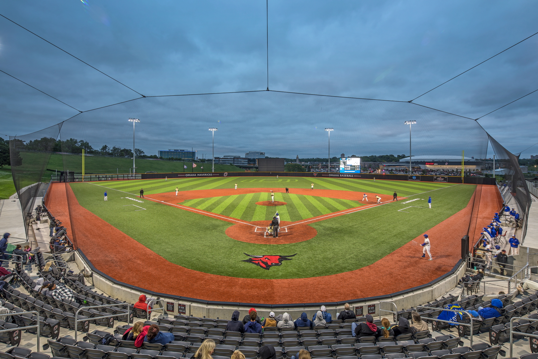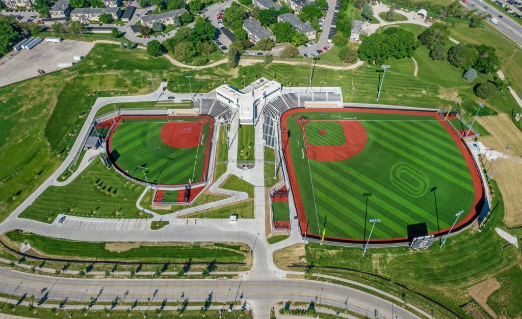 This project consisted of building a ballpark facility for the University of Nebraska at Omaha. The ballpark features one 1,483-person capacity baseball stadium and one 854-person capacity softball stadium that share a common concourse. There are six notable structures within the concourse: a box office, baseball field press box, softball field press box, pavilion, restroom and facilities building, and concessions building, with approximately 10,000 square feet of functional space between the six buildings.